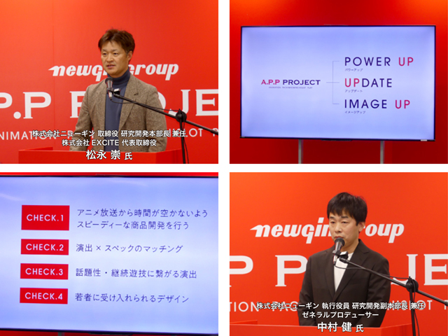 発表会では始めに株式会社ニューギン 取締役 研究開発本部長 兼任 ライツ部部長ならびに株式会社EXCITE代表取締役の松永崇氏が登壇。松永氏は「遊技人口が減少しつつある昨今において、アニメIPによる若年新規ユーザーは増加傾向にあります。弊社では、新規ファンに遊技を体験してもらえる環境構築が急務だと考え、新プロジェクト『A.P.P』を発足いたしました。A.P.PはANIMATION/Pachinko&Pachislot/Playの頭文字をとったもので、人気アニメ作品と日本の大衆文化である遊技機の融合による新しい価値を創造していきます」と挨拶した。